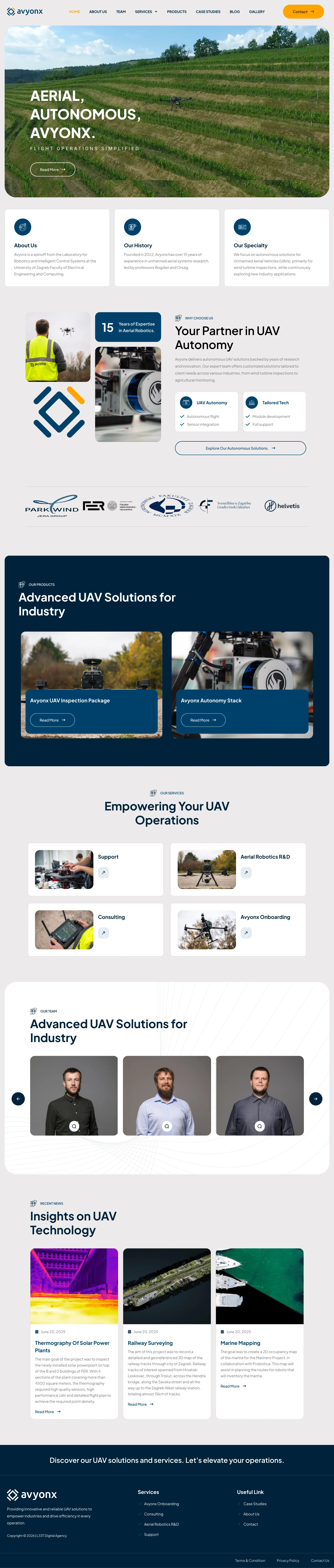 Avyonx is an advanced technology company specializing in autonomous unmanned aerial vehicle (UAV) solutions, with a strong focus on industrial applications such as wind turbine inspections and infrastructure monitoring. Founded as a spin-off from the University of Zagreb’s Faculty of Electrical Engineering and Computing, the company combines over 15 years of research expertise with real-world deployment experience to deliver cutting-edge aerial robotics solutions.