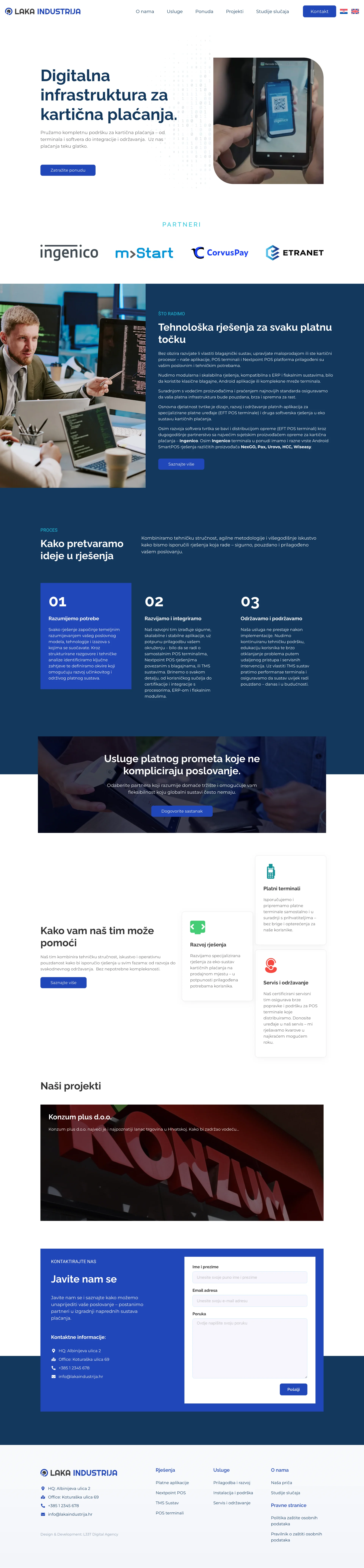 A strong emphasis is placed on flexibility and compatibility, with solutions designed to work across various authorization systems, card types, and hardware devices. The platform communicates technical depth while remaining accessible, positioning Laka Industrija as a reliable partner for banks, retailers, and payment service providers.